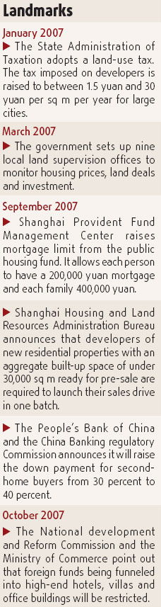 "The investment market may feel the pinch, and it is likely that foreign investors will be more vulnerable to these policy changes this year," said Lee, adding that he expects more severe measures, which will significantly cool down the investment market. James MacDonald, senior manager of Research at Savills China, however, said: "In the institutional investment market, it's not necessary that new policies will be introduced and will affect the market in a big way. Instead, it is the more stringent implementation of previous regulations that has to be watched." "The government's tighter monetary policy this year is expected to have a negative impact on the real estate investment market, which is highly dependent on bank loans," said Chen Sheng, director of the China Index Academy, which tracks property prices. Wang Qing, an economist at Morgan Stanley Asia Ltd, said in a report that sectors with a high debt-asset ratio, such as real estate, tend to experience larger declines in fixed-asset investment growth after credit tightening. The debt-asset ratio of the real estate sector is over 70 percent. Liu Shiyu, deputy governor of the People's Bank of China, said the government will strengthen commercial real estate management and adjust the real estate credit structure to prevent risk. A survey was conducted by the State Administration for Industry and Commerce in December on foreign investment in China's real estate sector. The move came on the heels of the Ministry of Construction opening a research meeting on the implementation of existing policies restricting foreign investment in real estate. "Many foreign investors would probably shift to second- or third-tier cities, including Chengdu, Chongqing and Hangzhou, to avoid fierce competition and dodge the stricter restrictions on foreign investment in the first-tier cities such as Shanghai," said Kenny Ho, head of research at Jones Lang LaSalle (Shanghai). Acquisition in the city amounted to 28 billion yuan ($3.89 billion) in 2007, up only 15.7 percent from the year before, according to statistics from Jones Lang LaSalle. Office investment accounted for 66 percent of the total, followed by residential (13 percent), mixed projects (10), logistics (7) and retail (4).