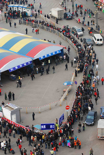 Passengers queue to buy train tickets at Guiyang Railway Station, Guizhou Province, February 12, 2008. Chinese railways had carried 24.47 million passengers during the weeklong Spring Festival holiday, the Ministry of Railways said on Wednesday. [Xinhua]