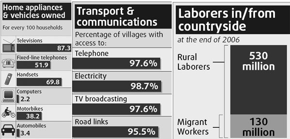 The National Bureau of Statistics yesterday released its first report based on the 2006 census, which is designed to reflect the overall development of rural areas and the agriculture sector, as well as the living standards of rural residents. The percentage of villages which had access to road links, telephone services, electricity and TV broadcasting by the end of 2006 were 95.5 percent, 97.6 percent, 98.7 percent and 97.6 percent, according to the survey. For every 100 households in rural areas, there were 87.3 television sets, 51.9 fixed-line telephones, 69.8 mobile phones, 2.2 computers, 38.2 motorbikes and 3.4 automobiles. Meanwhile, 74.3 percent of the villages had clinics; and at the township level, 98.8 percent of towns had hospitals, and 66.6 percent, nursing homes for the elderly. "The figures show the government's increased spending to improve rural livelihoods has started to pay off," said Du Zhixiong, a researcher at the Rural Development Institute of the Chinese Academy of Social Sciences (CASS). The central government has launched a slew of initiatives in the past few years to speed up the development of the countryside, which has lagged behind urban areas over the years. The aim is not only to bridge the income gap between urban and rural areas, but also improve the social services in the countryside. Last year, the per capita income of rural residents averaged 4,140 yuan ($580), about a third of earned by urban residents. The central government plans to increase its budget for rural investment by more than a fourth to 520 billion yuan ($72.8 billion) this year, Chen Xiwen, director of the office of the central leading group on rural work, told Xinhua News Agency in an interview. Government spending on rural projects amounted to 420 billion yuan ($58.8 billion) in 2007 and 340 billion yuan ($47.6 billion) in 2006. "The survey also reveals areas that should be further improved," said Du from the Chinese Academy of Social Sciences. At the end of 2006, only 48.6 percent rural residents had access to tap water; and only 15.8 percent of villages had garbage treatment facilities. The survey also found China had 530 million rural laborers at the end of 2006. Of them, 70 percent were engaged in agriculture work such as farming, forestry, livestock breeding, fishing and related services. That was nearly 5 percentage points down from the end of 1996, as more and more have moved to work in local factories or cities. There are now 130 million migrant workers from the countryside, about a fourth of the rural labor force. The latest census, the second of its kind, was conducted among more than 650,000 villages and nearly 230 million households. The first national agriculture survey was a decade ago. The NBS will release five other reports based on the 2006 survey in the coming weeks, which will cover issues such as the living conditions of rural residents and the environment of rural communities.
