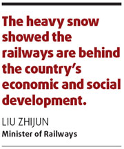 "The heavy snow showed the railways are behind the country's economic and social development," he said. "It reminded us that we have to try every possible means to increase our railway transportation capability."