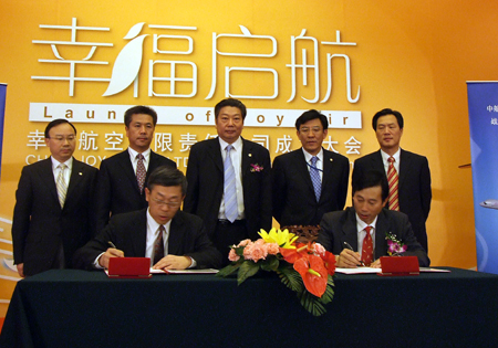 Representatives from AVIC I Commercial Aircraft Co Ltd and China National Aero-Technology Import & Export Corporation (CATIC) sign a strategic cooperation framework agreement today in Beijing at the establishment ceremony of Joy Air Co Ltd. [chinadaily.com.cn]