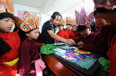 A teacher of the Naxi ethnic group teaches a student to perform traditional dance of Dongba culture at a primary school in Lijiang, southwest China's Yunnan Province, Sept. 4, 2009.