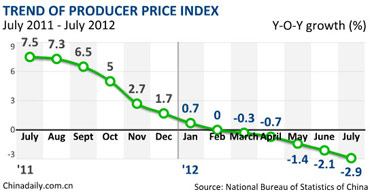 China's Producer Price Index, a main gauge of inflation at the wholesale level, fell 2.9 percent in July from a year earlier, the National Bureau of Statistics said Thursday.