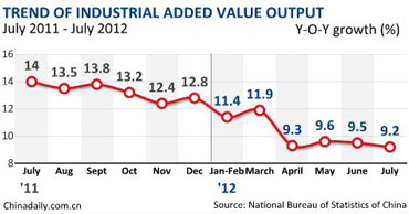 China's industrial value-added output expanded 9.2 percent year-on-year in July, a pace slightly slower than the 9.5-percent level in June, the National Bureau of Statistics said Thursday.