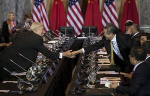 A staff member (L) receives a customer at a 3D-printing experience store in Tianjin, North China, July 16 2013. [Photo / Xinhua]