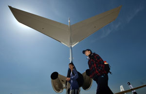 The inventor of 3D-printed house Ma Yihe (L) shows a model of a 3D-printed house in Shanghai, east China, April 12, 2014. Ten houses have been built of construction waste using a 3D printing technology in 24 hours in Shanghai. (Xinhua/Pei Xin)
