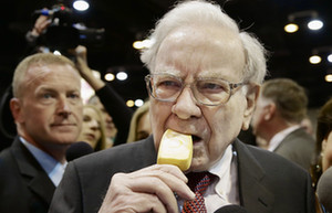 Berkshire Hathaway Chairman and CEO Warren Buffett eats an ice cream bar while touring the exhibition floor prior to the annual shareholders meeting on Saturday, May 3, 2014, in Omaha, Neb. More than 30,000 shareholders are expected to fill the CenturyLink Arena to hear Buffett and Berkshire Vice Chairman Charlie Munger discuss their business. [Photo/dfic.cn]