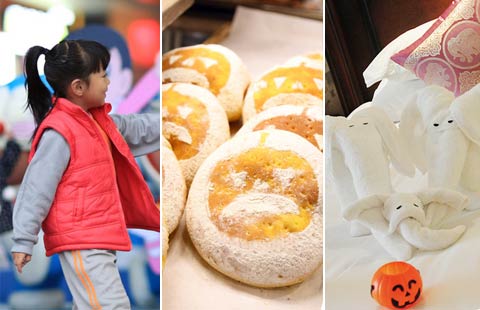 The First World Hotel in Hangzhou city, Zhejiang province has put together a Halloween suite featuring themed decorations and pumpkin treats, Sept 26, 2014. [Photo / IC]