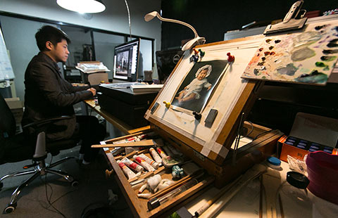 Yang Wei (left) and Wang Xu pose in their photo studio in Beijing, Jan 11, 2016. [Photo/Xinhua] |
