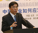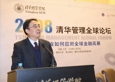 Xie Weihe, vice president of Tsinghua University delivers a welcoming speech at the Tsinghua Management Global Forum held in Beijing, Nov 14, 2008.