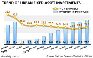 China's urban fixed asset investment rose 24.9 percent in the first 11 months year-on-year to hit 21.07 trillion yuan ($3.19 trillion), China's statistics authority said on Dec 11.