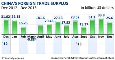 China's 2013 exports rise 7.9%, imports up 7.3%