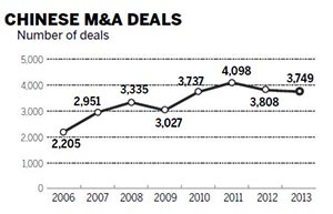 The value of deals announced in the Chinese mergers and acquisition market reached a record high in 2013.