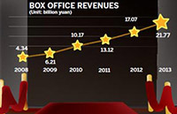 China's box office revenue reached 21.77 billion yuan ($3.57 billion) in 2013, increasing 27.51 percent year-on-year.