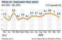 China's consumer price index, a main gauge of inflation, grew 2.6 percent year on year in 2013, and 2.5 percent in December of 2013.