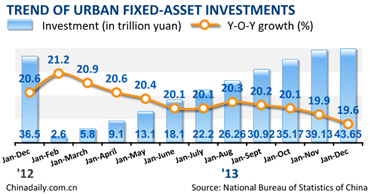 China's urban fixed asset investment in 2013 increased 19.6 percent year-on-year to 43.65 trillion yuan ($7.08 trillion), the National Bureau of Statistics said on Monday.