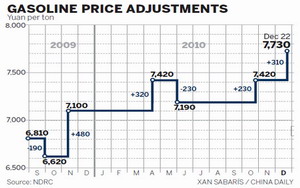 China will raise gasoline and diesel prices 310 yuan ($46) per ton and 300 yuan per ton, respectively, beginning Wednesday, the National Development and Reform Commission (NDRC) announced Tuesday.