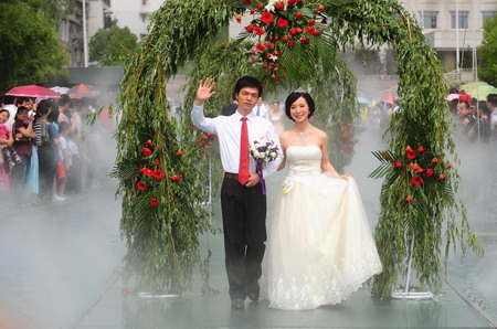 Twenty couples were married at a collective wedding ceremony on May Day in Wuhan, the capital of central China's Hubei province. [Photo / Xinhua]