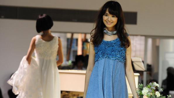 Wedding dresses gracing the catwalk at a fashion show in Tokyo. The wedding dresses on the show are all made from eco-friendly raw materials, including silk, paper and a biodegradable fiber made using polylactic acid extracted from corn.