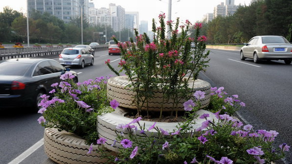 Used tires become flower pots on Chaoyang North Road in Beijing.