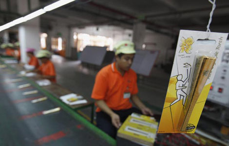 A Zindart employee packages "Mini Olympic Torch" souvenirs at a production line in a factory, authorised to be the producer for souvenirs of London 2012 Olympic Games in Dongguan, Guangdong province June 26, 2012.