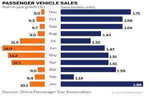 China's auto sales rose 2.3 percent year on year to 2.09 million units in November.