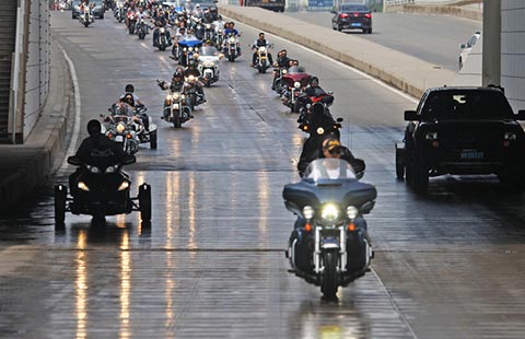 Two hundred enthusiastic motorcyclists drove luxury superbikes to enjoy the city's splendor at the Binhai New Area in Tianjin on Saturday.