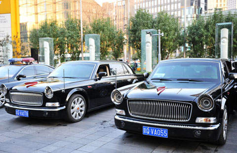 Three Hongqi (red flag) L5 limousines are seen parked outside a hotel in Beijing on November 4, 2014. The high-end cars will be used to receive foreign guests during the upcoming APEC. Each of the luxury cars is priced at six million yuan ($ 979,831).