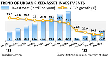 China's fixed-asset investment rose 20.1 percent year on year to 10.89 trillion yuan ($1.73 trillion) in the first five months of this year.