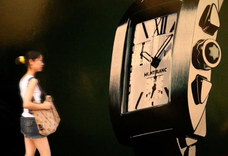 A girl looks at a poster of Montblanc watch in a street in Shanghai in this September 16, 2005 file photo. China announced Tuesday, March 21, 2006 its plan to impose a consumption tax on disposable wooden chopsticks, wooden floor panels, yachts, luxury watches and more oil based products as of April 1 of this year. The country would scrap consumption tax on skin-care and shampoo products from April 1. [newsphoto]