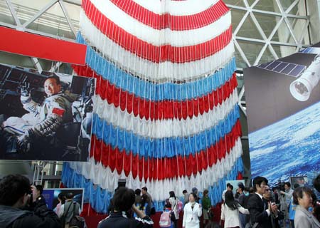 Visitors attend the Shenzhou VI spacecraft exhibition in Shanghai yesterday. The show features the escape capsule, parachute and the space food the ship carried. The event lasts till April 16. Shanghai residents were eager to visit the exhibition, snapping up 80,000 free tickets within half an hour yesterday. [newsphoto]