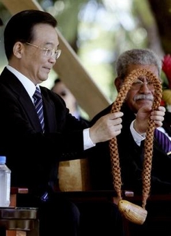 Chinese Premier Wen Jiabao, left, holds a whale's tooth during a traditional