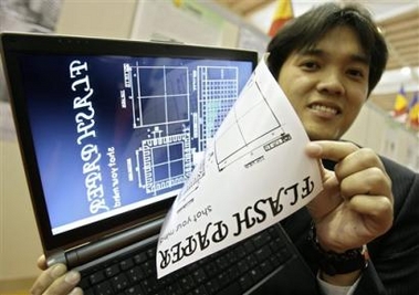 Chen Chia-Chun from China presents his invention, 'Flashy Paper,' a new