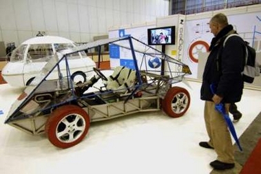 A visitor looks at the Bulle (rear) and EXE, two electric vehicles designed