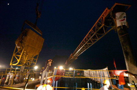 Construction workers cast the last concrete unit for the main section of the mammoth Three Gorges Dam on Friday morning in the middle reach o f the Yangtze River. The final concrete placement is due to finish on Saturday, which will mark the completion of the dam's main wall. [Xinhua]