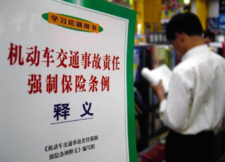 A book about the Regulation on Compulsory Traffic Accident Liability Insurance for Motor Vehicles. Drivers across China will be forced to cough up around 1,000 yuan (US$125) for the compulsory insurance before taking to the road next month. [newsphoto]
