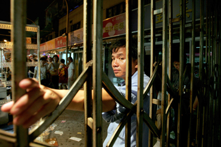 A staff member closes the door of Xiangyang market which was closed at half past nine on Friday evening in Shanghai June 30, 2006. [Reuters]