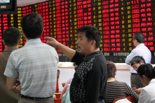 Shareholders watch the screen on the wall in a security company in