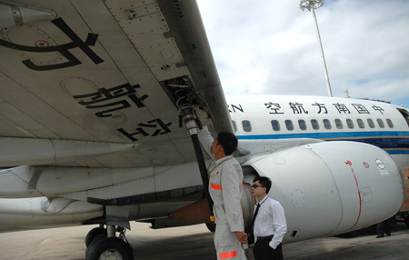 An airport ground worker fills a Southern Airline plane's oil tank at the Sanya Phenix International Airport, South China's Hainan Province, January 21, 2007. [newsphoto]