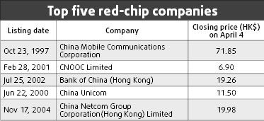 This year is set to see many of the Chinese conglomerates listed in Hong Kong head to the mainland market, following the trend set by the largest red chip, China Mobile. CNOOC, China's top offshore oil company and the No 2 among red chips by market value, last month said it might float A shares this year if certain technical difficulties are sorted out. Other large red chips such as COFCO International, the listed arm of COFCO China's flagship of grain, oil and foodstuff import and export and China Insurance International Holdings Co Ltd have also expressed their intention to list on the mainland. The attraction of red chips and the mainland market is mutual. Excessive liquidity in the A-share market is piling pressure on the securities regulator to allow more companies to list in Shanghai and Shenzhen and the red chips are only too happy to grab the opportunity. "The red chips and H-share companies should come to the mainland as soon as possible as the flood of new funds into the A-share market has created great demand for new shares," said Zhang Qi, an analyst with Haitong Securities. But if a company wants to list directly on the mainland, it should be locally incorporated as Chinese laws do not allow overseas-incorporated companies to issue A shares. "And it is impossible for Chinese regulators to change the law and permit all overseas-incorporated companies to issue A shares in the short term," Li Yongsen, professor with Renmin University of China, said. According to Li: "The regulators are afraid that once the ban is lifted, many foreign companies will want to list on the mainland. The government certainly wants the red chips to come to the mainland market first." The securities regulator prefers a direct listing model for red chips rather