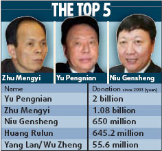 Of the total of 10 billion yuan ($1.29 billion) donated last year, the amount given by the 100 was 3.9 billion yuan ($505 million) compared with 3.75 billion yuan ($436 million) the previous year.