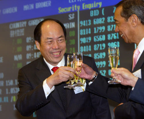Country Garden chairman Yang Guoqiang (L) celebrates with Ronald Arculli, Chairman of Hong Kong Exchanges and Clearing Limited (HKEx), during the debut at the Hong Kong Exchanges in Hong Kong April 20, 2007. Shares in Country Garden Holdings Co, which raised US$1.66 billion in the biggest-ever IPO by a Chinese developer, jumped 35 percent in their Hong Kong debut. [Reuters]