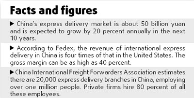 Sinotrans, another domestic delivery giant, seems to be considering whether it should exit the business, or up investment. Zhang Jianwei, Sinotrans' president, used to say his company would continue to strengthen its position in the domestic market. The firm's air delivery arm, Sinotrans Air Transportation Development Co Ltd, still holds 25 percent of international express delivery market.