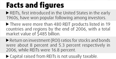 distributed to investors." According to global statistics from Harvest Fund, return on investment (ROI) ratios for stocks and bonds were about 8 percent and 5.3 percent respectively in 2006, while REITs were 16.8 percent. Capital raised from REITs is not usually taxable. According to Harvest, there were more than 480 REIT products listed in 19 countries and regions by the end of 2006, with a total market value of $485 billion. Ren at Industrial Securities said REITs are an easier way for companies to raise capital than an IPO (initial public offering), which aren't always available to bottom- or mid-tier real estate companies, or a bank loan, which can be difficult to secure. Zhang agreed, adding that REITs need a long-term capital investment from investors in order to improve the real estate management. According to the SSE's Chen, the exchange is developing a worldwide leading Next Generation System (NGTS) that can provide three different trading platforms for the product, including a cross-matching system, a bulking trading transfer platform and a bilateral quoting platform for fixed-income products with completed market marker system. Chen said the exchange is also considering taking measures to increase market liquidity, including the expanding mortgage loans and introducing related REIT index products. "Compared with the inter-bank market and the property rights exchange, the stock exchange has an advantage of wide investors base, timely information disclosure and effective supervision," said Chen, quoted in China Business News.