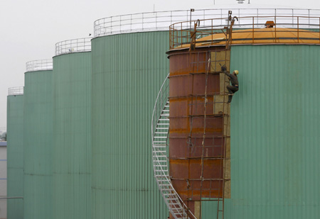 A labourer works at an oil refinery in Nanjing, capital of east China's Jiangsu province May 15, 2007. China's crude oil imports surged 23 percent in April from a year earlier to a record high, while net product imports also climbed 11 percent as refiners geared up for peak summer demand, government data showed on Tuesday. [Reuters]