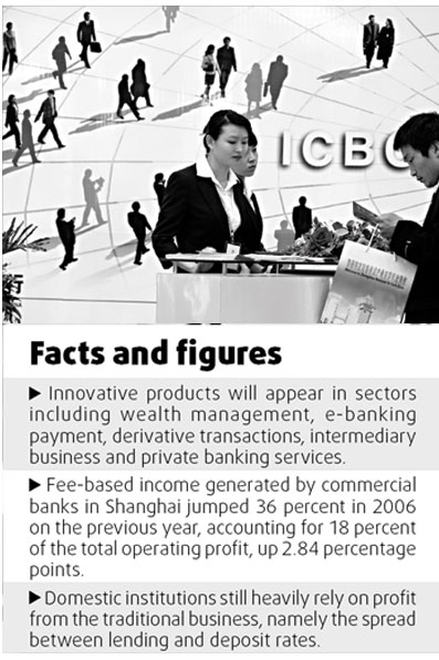 improvement in the overall financial environment. Innovative products will appear in sectors including wealth management, e-banking payment, derivative transactions, intermediary business and private banking services, the regulator believes. For a long time, local banks in the city have been satisfied with just meeting the basic needs of customers and not actively pursuing changes. But as times change, customers have become techno-savvy and the threat from overseas rivals is far more real, the need for innovation is more pressing than ever. "Chinese commercial lenders are quickening their pace to institutionalize product innovation," the regulator said in a recent report. The banks are thus providing a wider range of wealth management products, becoming more active in renminbi derivative transactions, and offering new products to boost their housing mortgage lending business. Shanghai's credit card market is booming, e-banking has picked up and a wide range of trust products are flooding the market. Fee-based income generated by commercial banks in Shanghai jumped 36 percent in 2006 on the previous year, accounting for 18 percent of the total operating profit, up 2.84 percentage points. Electronic bank transactions by individuals also jumped 119 percent in the second half of 2006. But the regulator has been quick to add that many banks are merely doing what others have already developed. Statistics from the Chinese central bank's Shanghai headquarters indicate that domestic institutions still heavily rely on profit from the traditional business, namely the spread between lending and deposit rates. But this could change as overseas competitors propel local lenders to innovate, the regulator believes. Foreign banks will focus on several categories of financial services in which they have better expertise and which have higher profit potential. These include intermediate businesses in foreign currency and money management. Christine Ip, country head of Consumer Banking at Standard Chartered Bank's