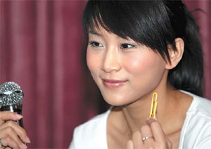 Ai Qingqing poses with her paperclip on January 23 when she announced that she had signed a contract with a record company to become a singer.