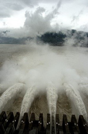 Flood water is discharged through the sluice on the Three Gorges Dam on June 19, 2007. Continuous downpour on the upper reaches of the Yangtze River has resulted in this year's heaviest flood, with 3,3000 cubic meters of water flowing into the Three Gorges Reservior every second. The 2007 plan for flood prevention and control has been implemented. [Xinhua]