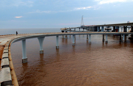 A visitor walks on a flyover of the bridge across the Hangzhou Bay in East China on June 26, 2007. The 36-kilometer (22-mile) bridge that its builders claim is the world's longest sea-crossing structure was formally linked-up Tuesday just south of Shanghai.[Xinhua]