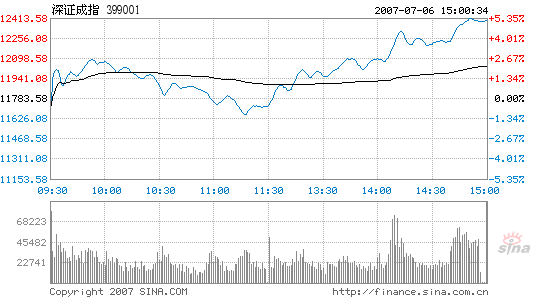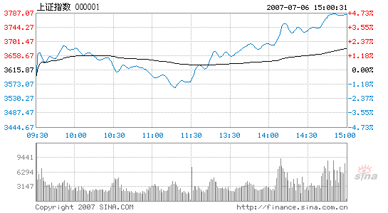 Stocks surge 4.58%, the biggest growth for a month, 07/06By Li Zengxin (chinadaily.com.cn)Updated: 2007-07-06 15:56 After seeing the largest plunge in comparative terms in a month yesterday, Chinese stocks made a U-turn and achieved the biggest growth for a month today. The Shanghai Composite Index closed at 3,781.35, up 165.48 points or 4.58 percent from yesterday's closing Total turnover of the stocks enclosed by the major indices was 142.1 billion yuan, the largest this week but still low compared with previous weeks. Shanghai Composite